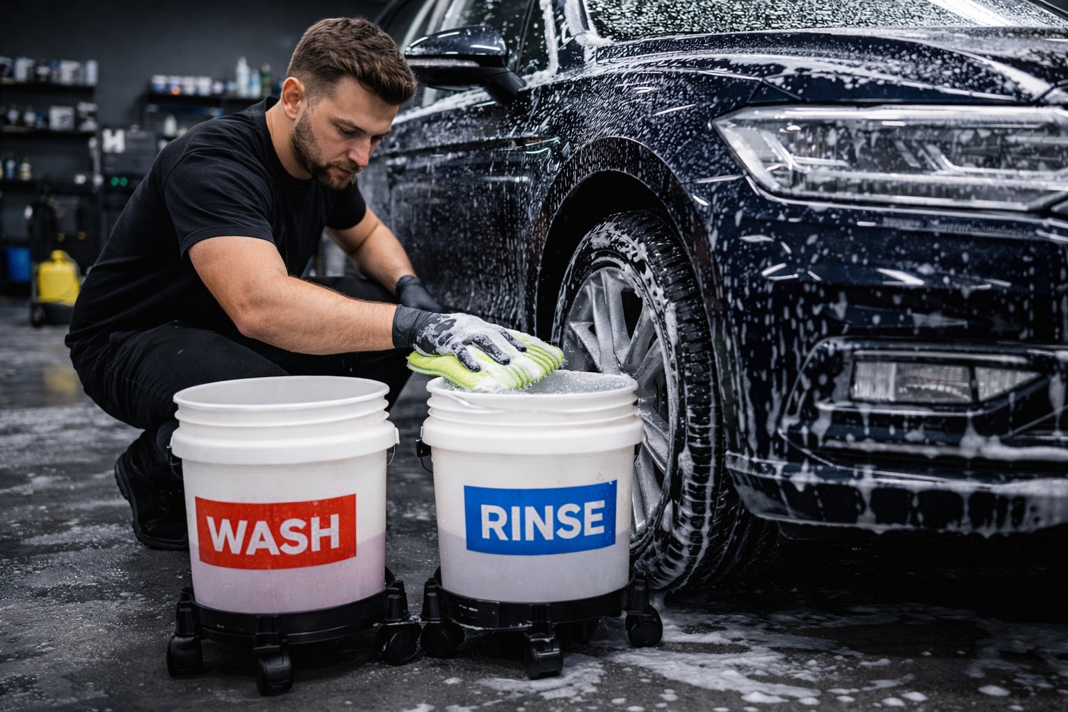 - Aplikacja szamponu samochodowego i ręczne czyszczenie karoserii miękką gąbką lub rękawicą.